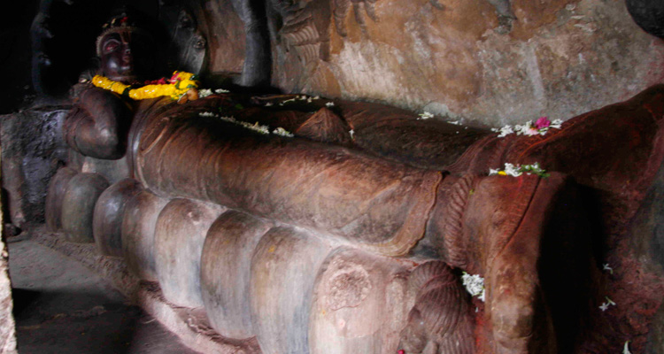 There are a number of caves on the hill side but the best known and the largest ones have four storeys. The first floor shows that this was Buddhist monastery designed in the style of Buddhist vihara. Here there are three separate sanctuaries for Brahma, Vishnu and Shiva - The trimurtis in Hindu mythology. The first floor is also adorned with beautiful paintings depicting scenes from mythological stories. Second floor contains a huge 5 m statue of Lord Vishnu in reclining position and is the main attraction of these caves. This beautiful statue is sculpted out of a single block of granite. The third floor contains numerous sculptures including depictions of lions and elephants.